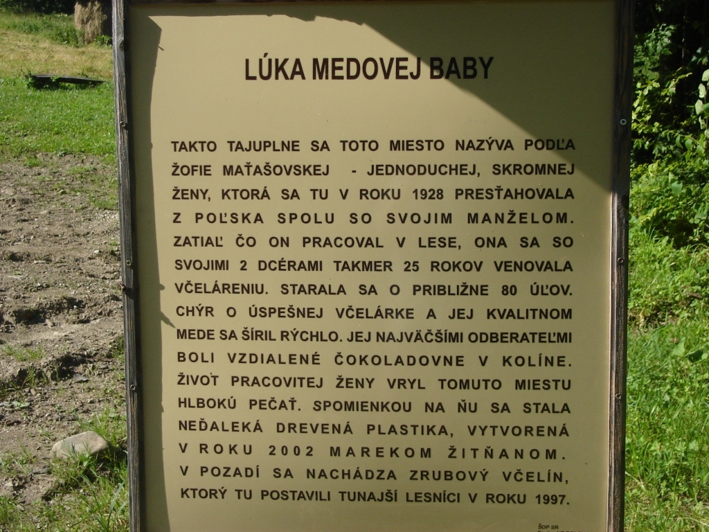 K realizácii tohto projektu pristúpili v roku 2002. Autor Marek Žitňan, sochár z Braislavy, vytvoril zo sedemmetrového dubového kmeňa prvé dielo. Venované je Žofii Maťašovskej, žene hôr, ktorá tu žila a ktorú tamojší ľudia nevolali ináč ako ,, medová baba". Počas celého svojho života sa venovala chovu včiel. Med od jej včiel bol vynikajúci. Dodávala ho ľuďom do šíreho sveta a posielala tiež na výrobu povestných perníkov do Pardubíc.